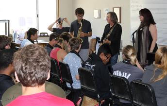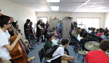 Celebrated and award-winning blues vocalist Janiva Magness then came forward with legendary Long Beach guitarist Brophy Dale to share some Chicago style blues. Magness, who was recently nominated for a Grammy, is from the old school of singers who could blow doors off their hinges without the aid of amplification. In addition to singing, she connected with students through sharing stories about her childhood, and insights into songwriting.